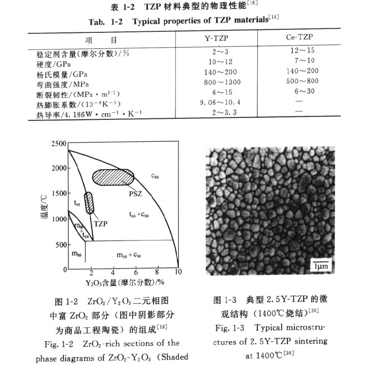 其中TZP是ZTC材料中室溫力學(xué)性能最高的一種材料(其力學(xué)性能見(jiàn)表1-2181),TZP中又以Y2O2作為穩(wěn)定劑的Y-TZP應(yīng)用最為廣泛。TZP材料的制備以相圖(圖1-2)作指導(dǎo)19,穩(wěn)定劑Y2O3的含量在1.75%~3.5%(摩爾分?jǐn)?shù))范圍變化。t-ZrO2的含量取決于組成、燒燒結(jié)溫度和時(shí)間般在60%~100%之間變化。典型的TZP材料徵觀結(jié)構(gòu)為粒徑為0.5~2m的等軸晶組成的均勻組織21(如圖1-3所示)。當(dāng)原料中含有異類(lèi)組分(如SiO2)時(shí),在界面上往往存在由異類(lèi)組分和Y2O3組成的玻璃相。